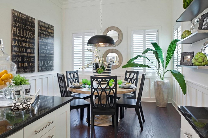 Kontrastreiche Möbel werden helfen, die Küche mit einem hellen Oberteil zu variieren - dunkle Holzstühle, weiche Teppiche, Tischdekor und eine "natürliche" Deckenlampe.