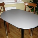 Über den ovalen Tisch kann man etwas sagen: Es dient ästhetischen Zwecken in der Küche und in der Wohnung.Die Eleganz der Form und das Fehlen von Ecken weisen auf einen raffinierten Stil hin, gleichzeitig aber auch auf Sicherheit. Eine kleine Küche kann einen ovalen Tisch aufnehmen, und für einen sicheren Zeitvertreib - das Design ist perfekt, Stöße und Kollisionen werden nicht auftreten.