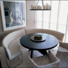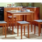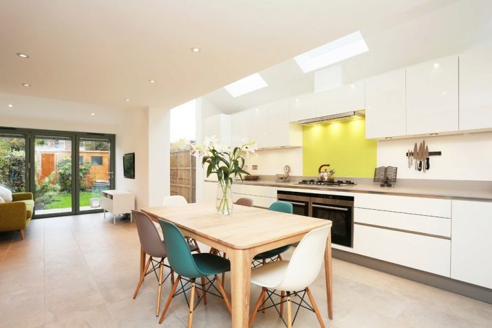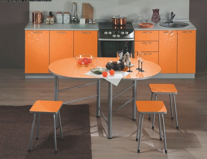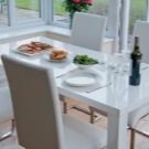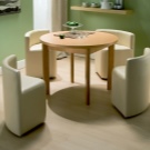 Bezugolnye Tabellen gelten als die "köstlichsten" Optionen für den Speisesaal - es gibt keine Verbindung mit Büromöbeln und Schulbank. Ihre Lage ist jedoch ziemlich problematisch: Sie brauchen eine geräumige Küche und helle Schattierungen der Wände. Außerdem ist dieses Design nicht für alle Designlösungen geeignet - es ist unmöglich, eine kreisförmige Form nahe der Wand zu platzieren.