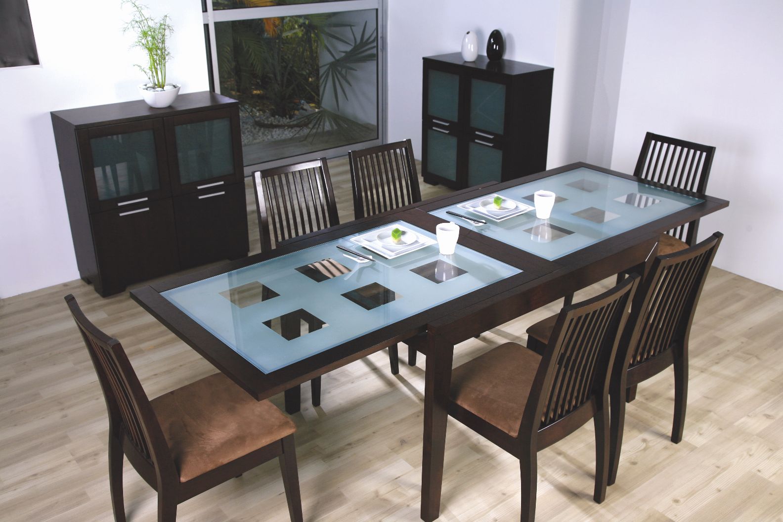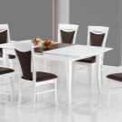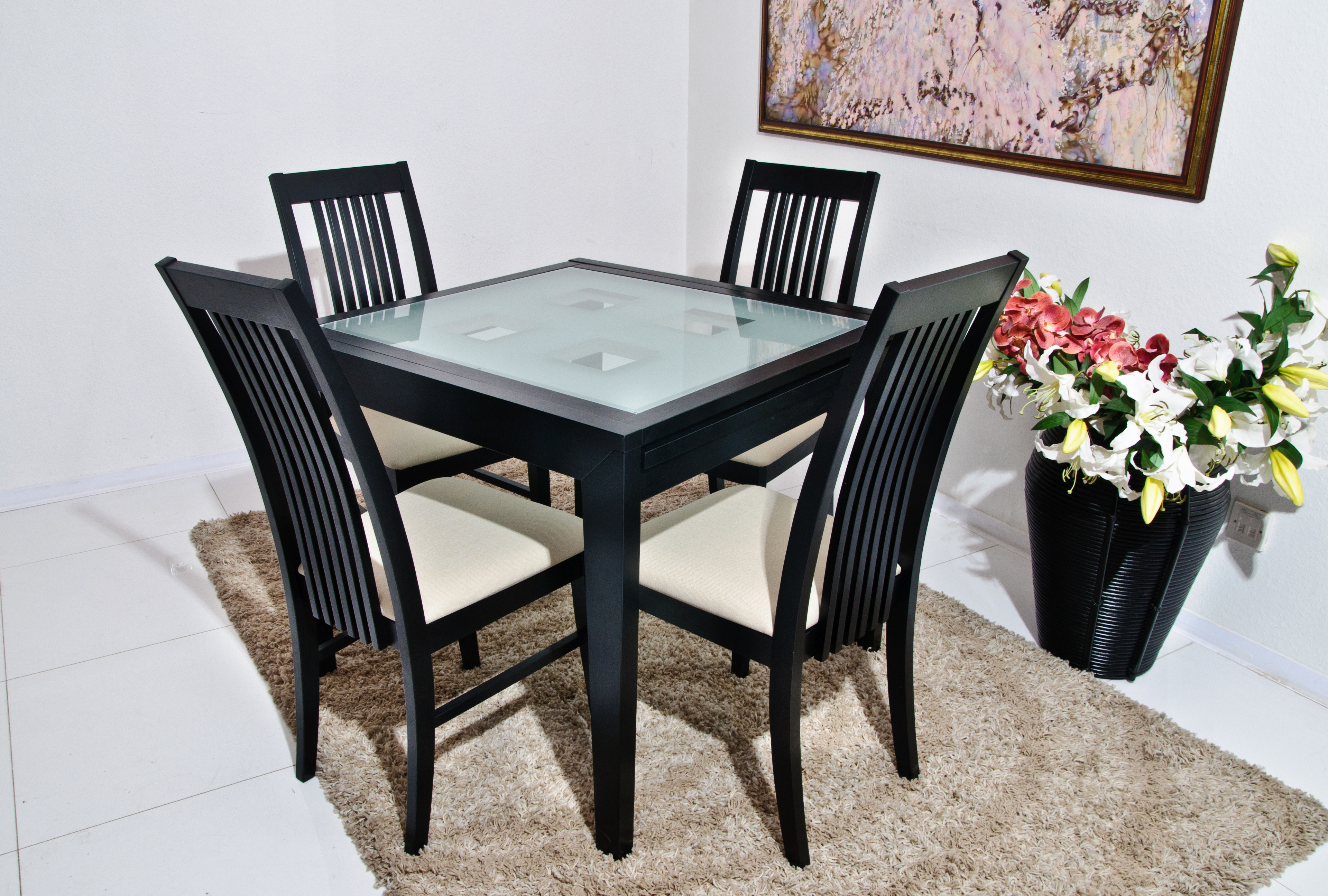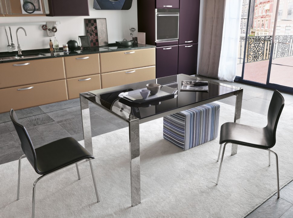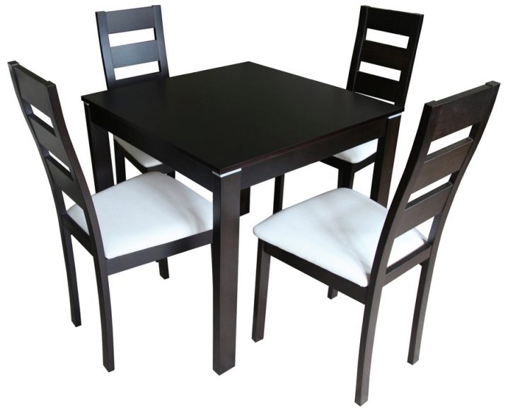 Klassische Formen können den Raum ausbalancieren, dem Inneren Vollständigkeit verleihen, Stabilität bringen. Ein quadratischer Tisch kann freier als ein rundes oder ovales positioniert werden. Eine solche Form passt ideal in das strenge und funktionelle Design.Seine Position kann am Fenster, an der Wand und zwischen dem Esszimmer mit einem Funktionsbereich sein. Allerdings ist die quadratische Form für eine Familie von zwei oder drei Personen nicht mehr geeignet, und die Unterbringung von Gästen wird schon problematisch sein.