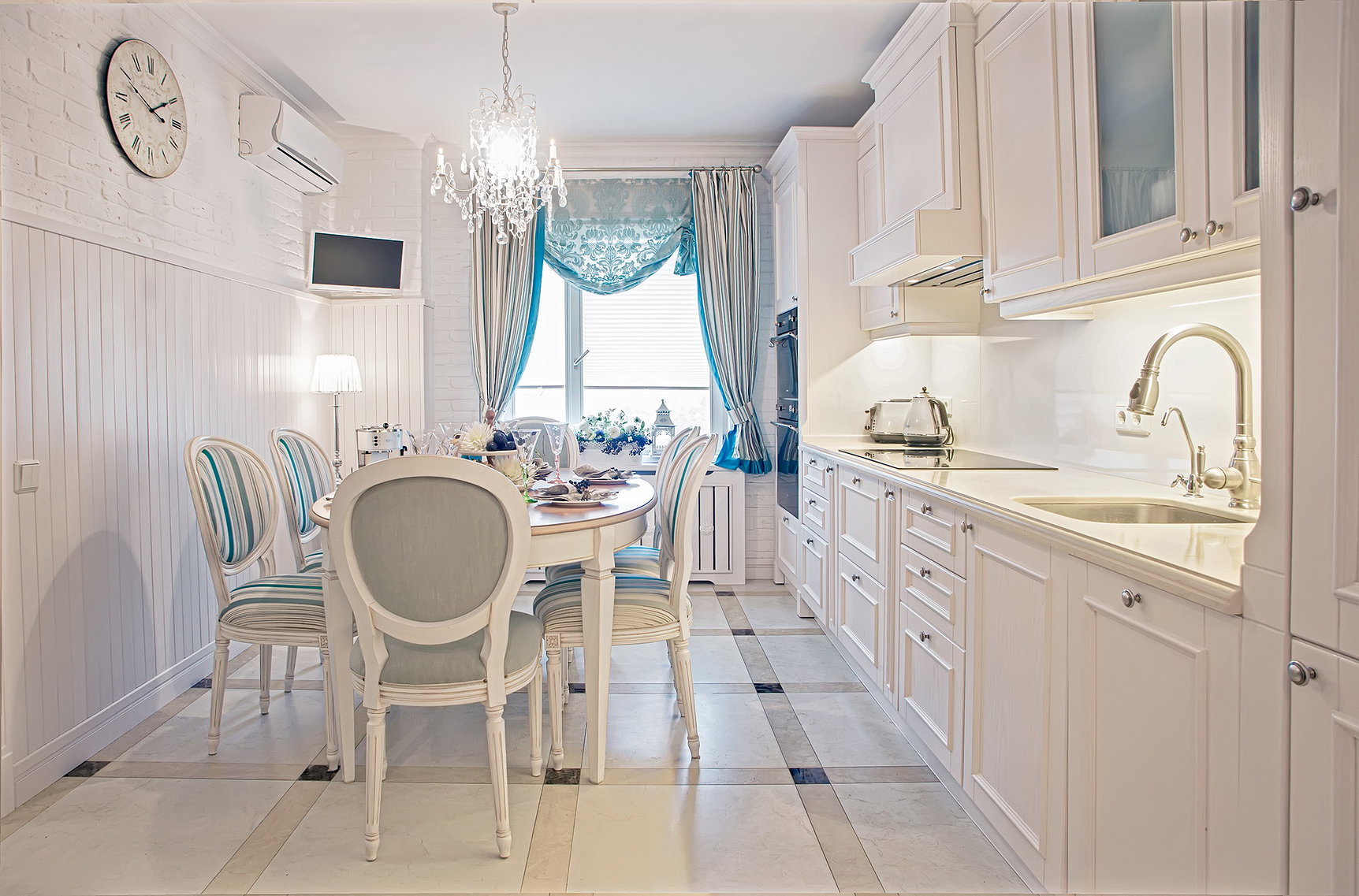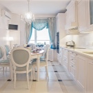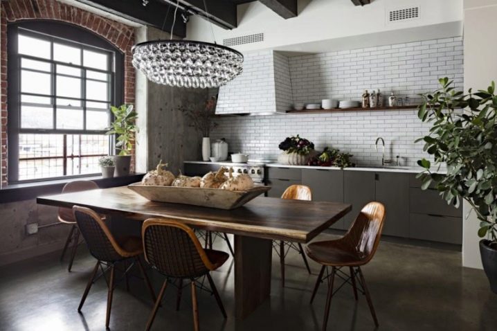 - Größe ist ein extrem wichtiges Kriterium, da der Komfort des Raumes davon abhängt.Es ist notwendig, das Gesamtmaterial des Raums mit der Größe des Modells zu korrelieren. Das optimale Verhältnis von Küche zu Tisch ist 1 bis 6;