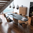 Eine andere Form von Klassikern, die fast immer und überall verwendet wird. Fast alle Materialien werden für solche Tische verwendet - von Glas bis Stein. Es ist möglich, einen solchen Tisch in der zentralen Zone der Küche am Fenster zu haben, um die Aussicht zu bewundern oder sie platzsparend an der Wand zu befestigen. Dank der rechteckigen Form können am Tisch 8 Personen Platz finden. Diese Form ist so universell, dass sie als Standard gilt und nur die funktionalen Parameter der Küche erfüllt.