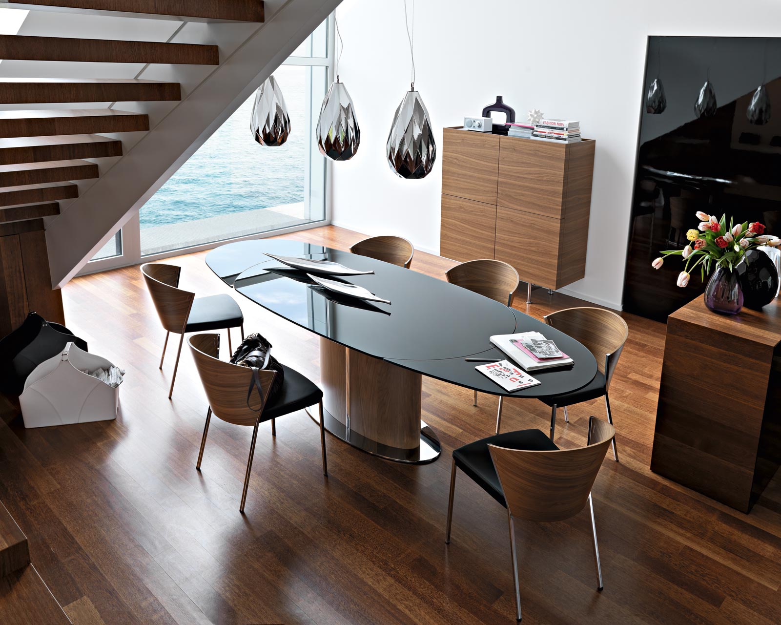 Es scheint, wo noch mehr Standard als ein Tisch mit einem Dreieck? Designer entwickeln jedoch die Idee, weiterhin zu erstaunen. Die facettenreiche Form des Tisches, die einziehbaren Teile, mag auf den ersten Blick protzig erscheinen, aber das ist nicht der Punkt. Obwohl diese Modelle falsch scheinen, dienen sie der Wirtschaftlichkeit und maximieren die Raumnutzung: zusätzliche Arbeitsbereiche, spezielle Anpassungen der Formen für die linke oder rechte Hand und Schubladen. Das ist pure Funktionalität, die sowohl in kleinen Küchen als auch in geräumigen Esszimmern akzeptabel ist.