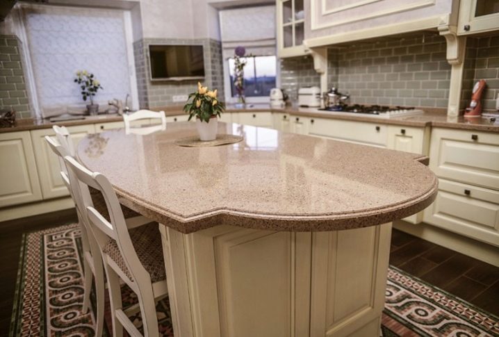 - Die Form spielt eine Rolle, wenn das Design des Raums in einem bestimmten Stil gestaltet ist. Die Form dient vor allem dekorativen Funktionen. Darüber hinaus können Sie dank bestimmter Arten von Arbeitsplatten einen kleinen Raum oder eine Zone ein großes Esszimmer erweitern;
