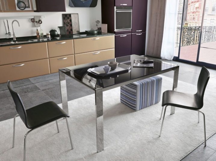 Bitte beachten Sie, dass die Größe der Küche bestimmt, welcher Tisch zu kaufen ist.Bei einem kleinen Raum sollte das Design klein und kompakt sein, besser noch, wenn es ein Teil der Einbaumöbel ist.