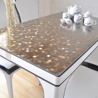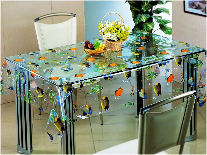 Ein transparenter Tisch unter einer transparenten Tischdecke sieht sehr originell aus. Glastisch und transparentes Wachstuch passen immer in das Gesamtdesign des Raumes. Wenn die Beschichtung nicht rein transparent ist, aber mit einem Muster, dann wird der Tisch mehr stilvoll und hell aussehen;
