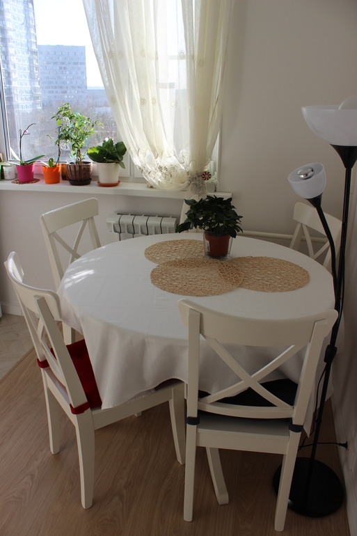 Wenn der Tisch rund ist, werden 40 cm zu seinem Durchmesser hinzugefügt - dies ist die Größe der Seite der Tischdecke.