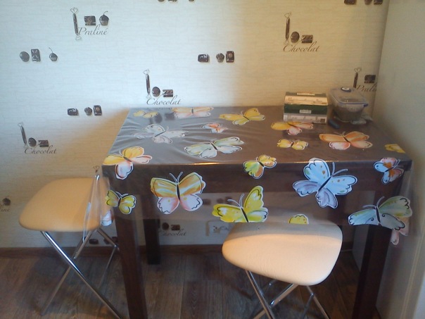 - hohe Haltbarkeit der Tischdecke aus Polyvinylchlorid, aufgrund derer die Basis für eine lange Zeit dienen wird. Und es gibt solche Sorten dieses Materials, die keine Angst vor entweder Schnitten mit einem Messer oder heißem Geschirr haben (Wachstuch darunter wird nicht schmelzen);