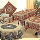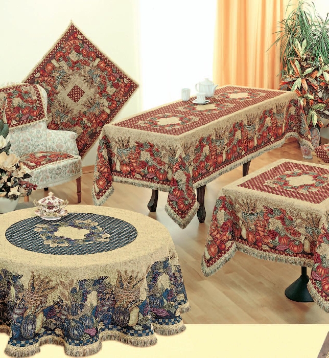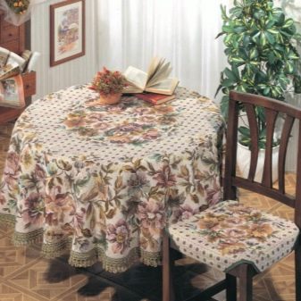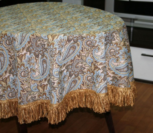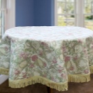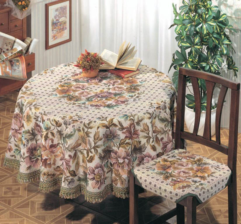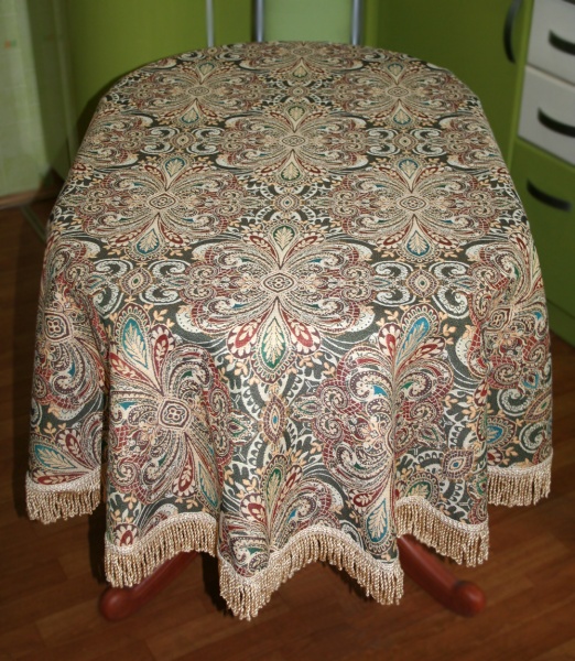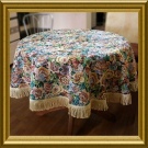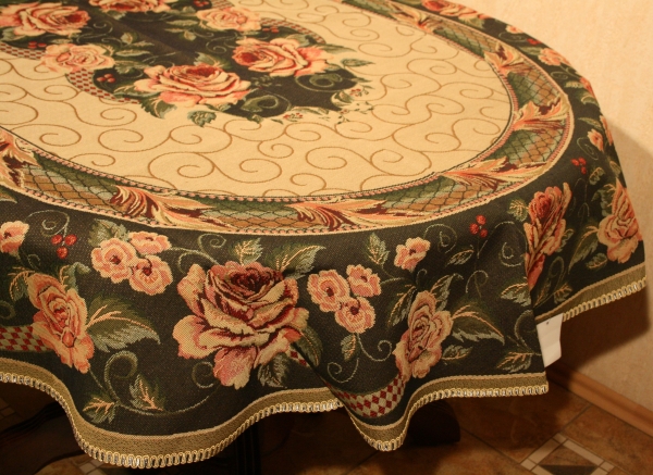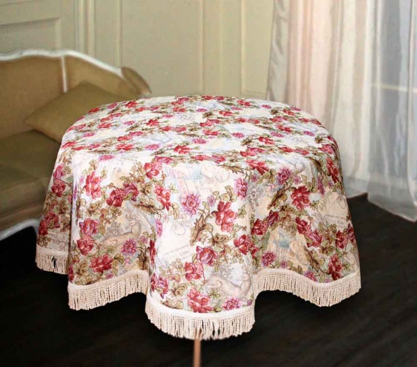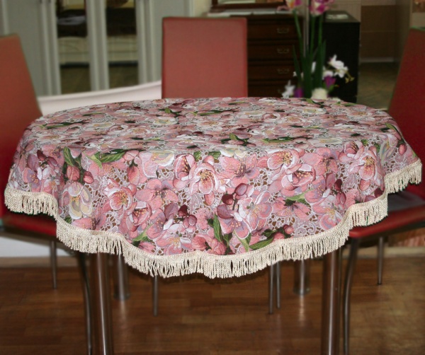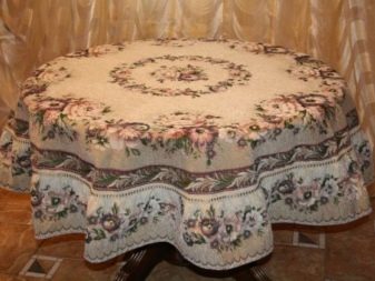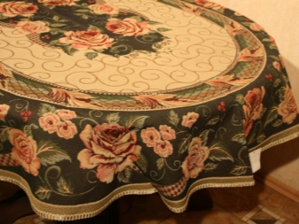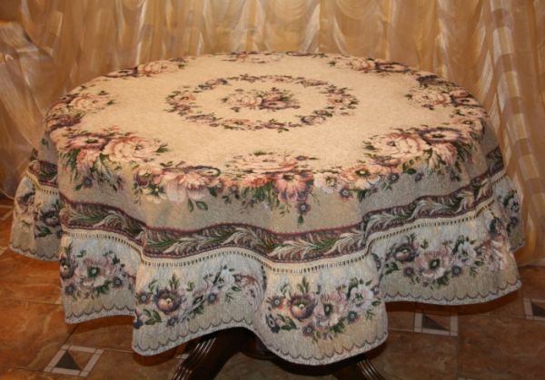 Diese Tischdecke verleiht der Portion ein etwas pompöses Aussehen. Diese Dekoration für die Küche im klassischen oder ethnischen Stil. Die Textur des Gewebes ist ziemlich dicht. Eine runde Tischdecke des Wandteppichs ist traditionell mit einem Blumenmuster verziert - ein großes Muster in der Mitte und ein kleineres sich wiederholendes Muster - entlang des gesamten Durchmessers von unten.