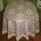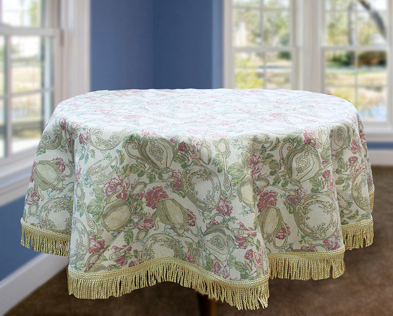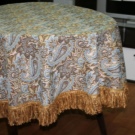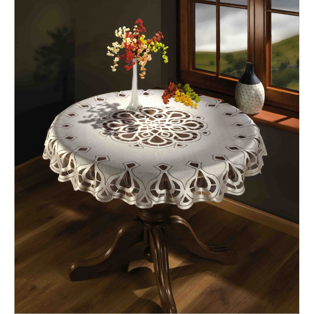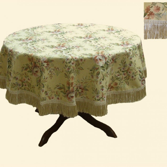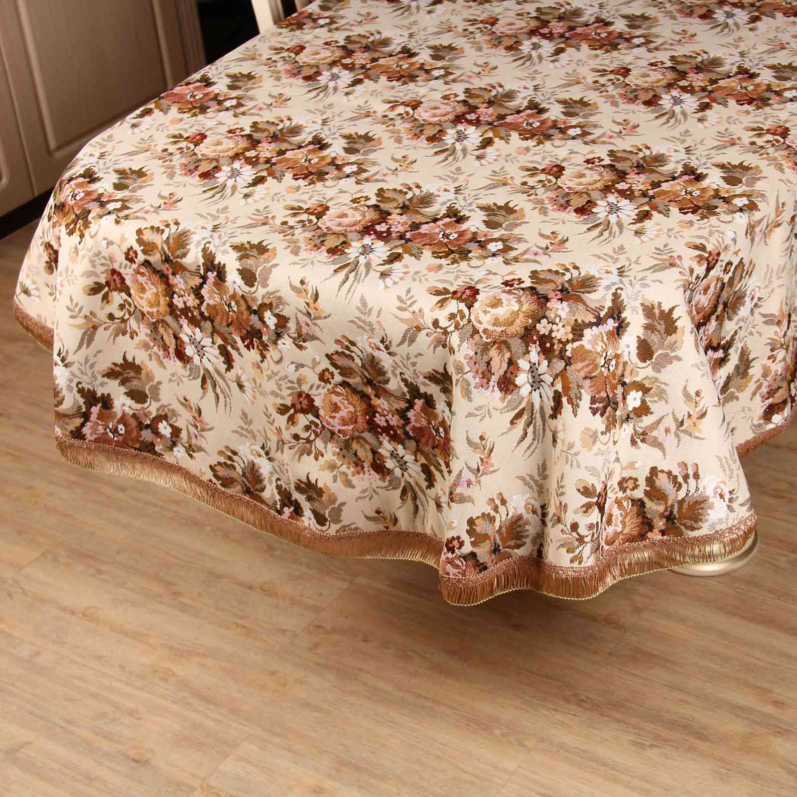 Diese Tischdecke verleiht der Portion ein etwas pompöses Aussehen. Diese Dekoration für die Küche im klassischen oder ethnischen Stil. Die Textur des Gewebes ist ziemlich dicht. Eine runde Tischdecke des Wandteppichs ist traditionell mit einem Blumenmuster verziert - ein großes Muster in der Mitte und ein kleineres sich wiederholendes Muster - entlang des gesamten Durchmessers von unten.