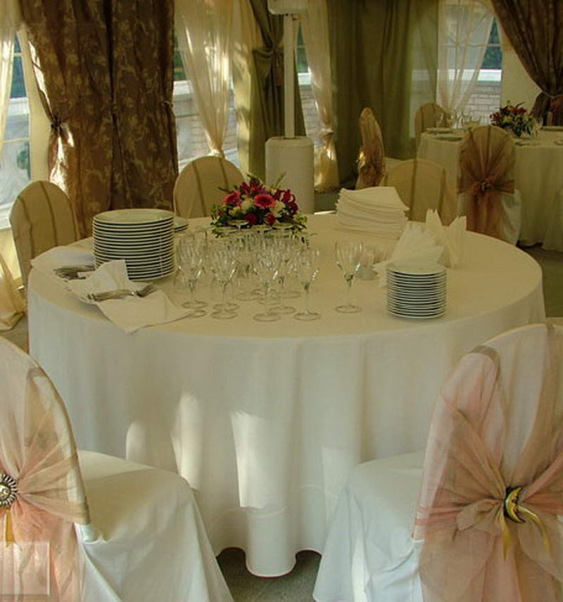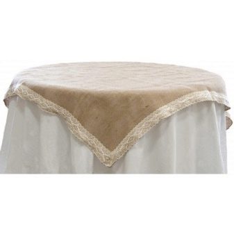 Modelle aus diesem natürlichen Material sehen gut aus und gehören zur Premiumklasse. Es war üblich, solche Tischdecken mit Stickereien zu schmücken und sie dem Brautkleid hinzuzufügen, das von ihrer edlen Herkunft erzählen sollte. Der Hochzeitstisch auf der Sommerveranda wird sehr stilvoll und vorzeigbar aussehen. Darüber hinaus ist Flachs, im Gegensatz zu Baumwolle, haltbarer und mit der richtigen Pflege wird mehr als ein Jahr dauern. Griff so etwas sollte vorsichtig und vorsichtig sein - Flachs schrumpft und ist schwer Flecken zu entfernen.