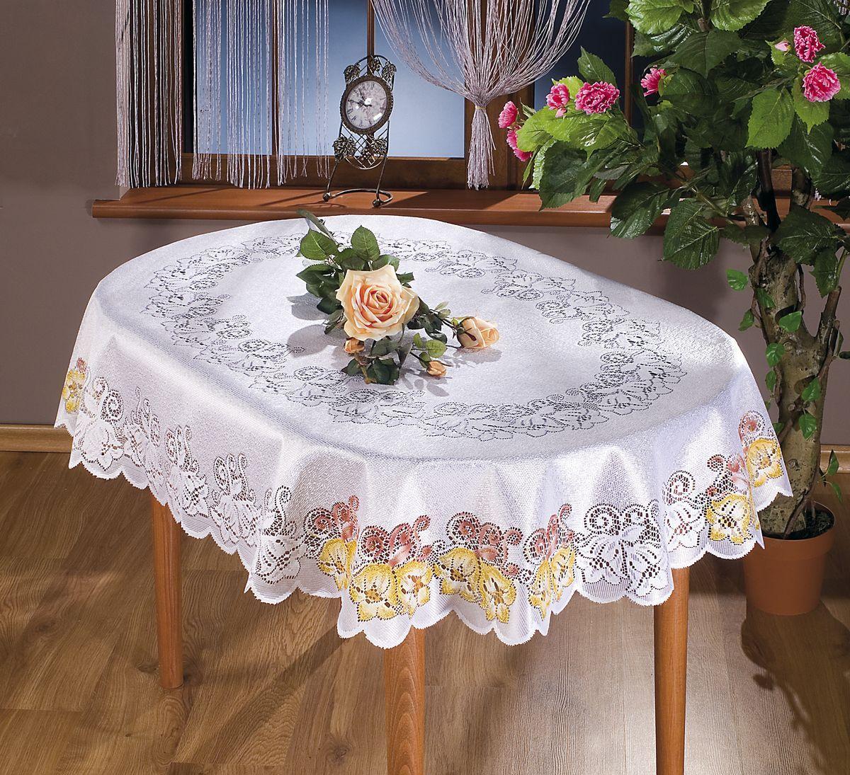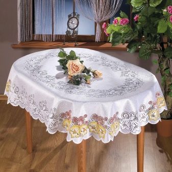 Eine sehr praktische Möglichkeit für den täglichen Gebrauch. Heute bieten die Geschäfte viele Farben und Dekore. Tischdecken aus Polyester nehmen nicht nur keine Feuchtigkeit auf - sie hinterlassen keine Flecken, außerdem können Sie eine Kopie mit einem dekorativen Muster aufnehmen, das für das Auge angenehm ist. Polyester ist leicht in einer Schreibmaschine zu löschen, benötigt kein Bügeln, verbläßt nicht und verbläßt nicht in der Sonne. Er hat jedoch Angst vor hohen Temperaturen und deshalb sollte ein heißer Wasserkocher und andere Gegenstände nicht auf eine solche Tischdecke gelegt werden. Schneiden Sie auch kein Brot und andere Produkte darauf - scharfe Gegenstände können die Tischdecke beschädigen.