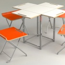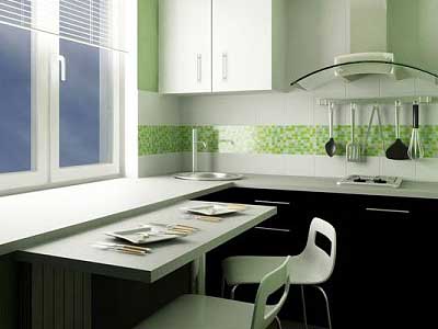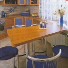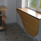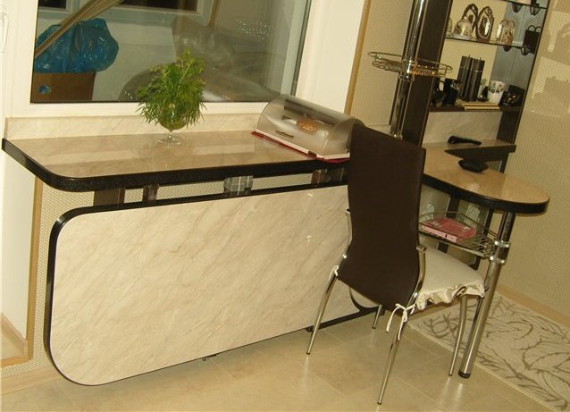 Klappbare Tischplatte - Es kann viele Optionen geben, ebenso wie die Prinzipien der Ausführung. Die Basis ist starr an der Wand befestigt und ein Klapptisch ist bereits daran befestigt, mit oder ohne Klappbänke. Der Nachteil dieses Ansatzes ist, dass er immer nach dem Essen gefaltet werden muss. Wenn es der Platz zulässt, kann er entfaltet oder allgemein ungeschickt mit Beinfreiheit gemacht werden, und Stühle können hineingeschoben werden, wenn sie nicht benötigt werden.