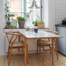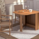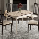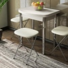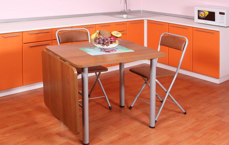 Klapptische und -tische - eine Option für die Küche, in der sie als separates Möbelstück verwendet werden und jederzeit entfernt werden können, um beispielsweise mehreren Personen, die gleichzeitig arbeiten, Platz zu schaffen. Es ist ratsam, Klappstühle hinzuzufügen. Zum Verkauf gibt es Angebote in verschiedenen Designs und Formen - rund, quadratisch, oval, sogar dreieckig.
