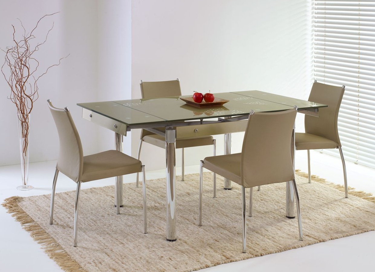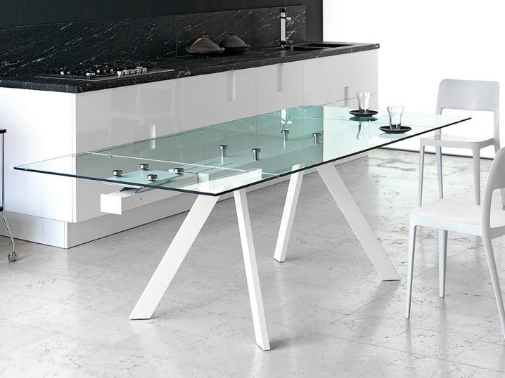 In der Regel wird der Esstisch zuletzt gekauft, dh nach der Installation des Headsets. Es hängt davon ab, wie gut das Headset gestaltet ist und wie viel Platz noch im Raum ist. Es ist wichtig, die Art und Weise, in der Sie sich im Raum bewegen, zu verstehen und sofort zu bestimmen. Der verbleibende Platz kann für den Essbereich reserviert werden. In der Version mit einem Klapptisch müssen Sie den zusätzlichen Platz berücksichtigen, den Sie zum Manipulieren benötigen - andernfalls können Sie ihn einfach nicht erweitern. Heute zum Verkauf können Sie die folgenden Optionen finden: