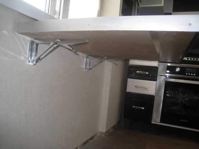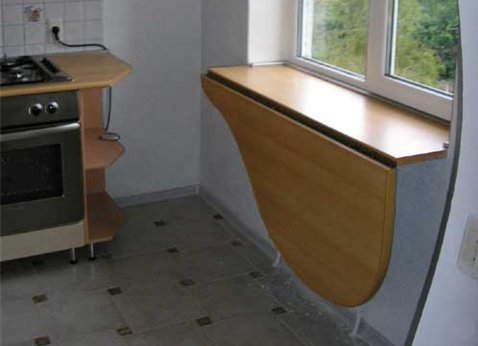 Einen solchen Tisch nach dem Kauf alleine zu montieren, stellt keine Schwierigkeit dar und jeder, der weiß, wie man einen Schraubenzieher hält und einen Bohrer benutzt, wird damit zurechtkommen. Sein Vorteil ist, dass es, zusammen mit der Fensterbank, fest an der Wand - der tragenden Struktur - befestigt ist. Die Fertigstellung erfolgt in der Regel in der Farbe der Küche, aber es kann mit Lack, Polymeren und sogar Naturstein erfolgen. In diesem Fall wird das Faltteil schwer.