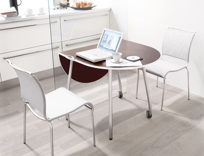 Viertens, bestimmen Sie die Größe des verfügbaren Platzes in der Küche. Ein zusammengeklappter Tisch sollte in der Küche so platziert werden, dass er einen minimalen Platz einnimmt. Wenn er ausgeklappt ist, sollte er so herumlaufen, dass er nicht herumstolpert.