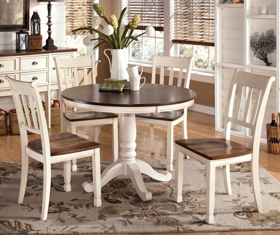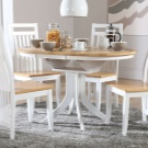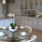 Ein runder Tisch bringt mehr Komfort in Ihre Küche. Es ist mit verschiedenen Stilen im Innenraum kombiniert, gibt Leichtigkeit und hat keine scharfen Ecken. Hinter ihm können problemlos mehr als vier Personen Platz finden, während niemand in die Ecke des Tisches geschoben wird. Es ist falsch, es in der Ecke der Küche zu platzieren, weil es nicht den ganzen nützlichen Raum des Tisches benutzt und es kann maximal 3 Personen unterbringen. Ein solcher Tisch wäre jedoch keine gute Lösung für eine kleine Küche, da Sie ihn ständig von Ort zu Ort bewegen oder umgehen müssen.
