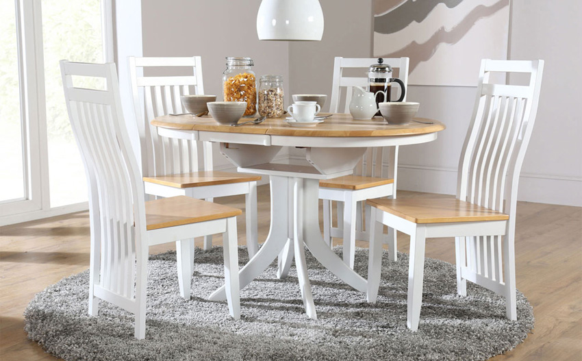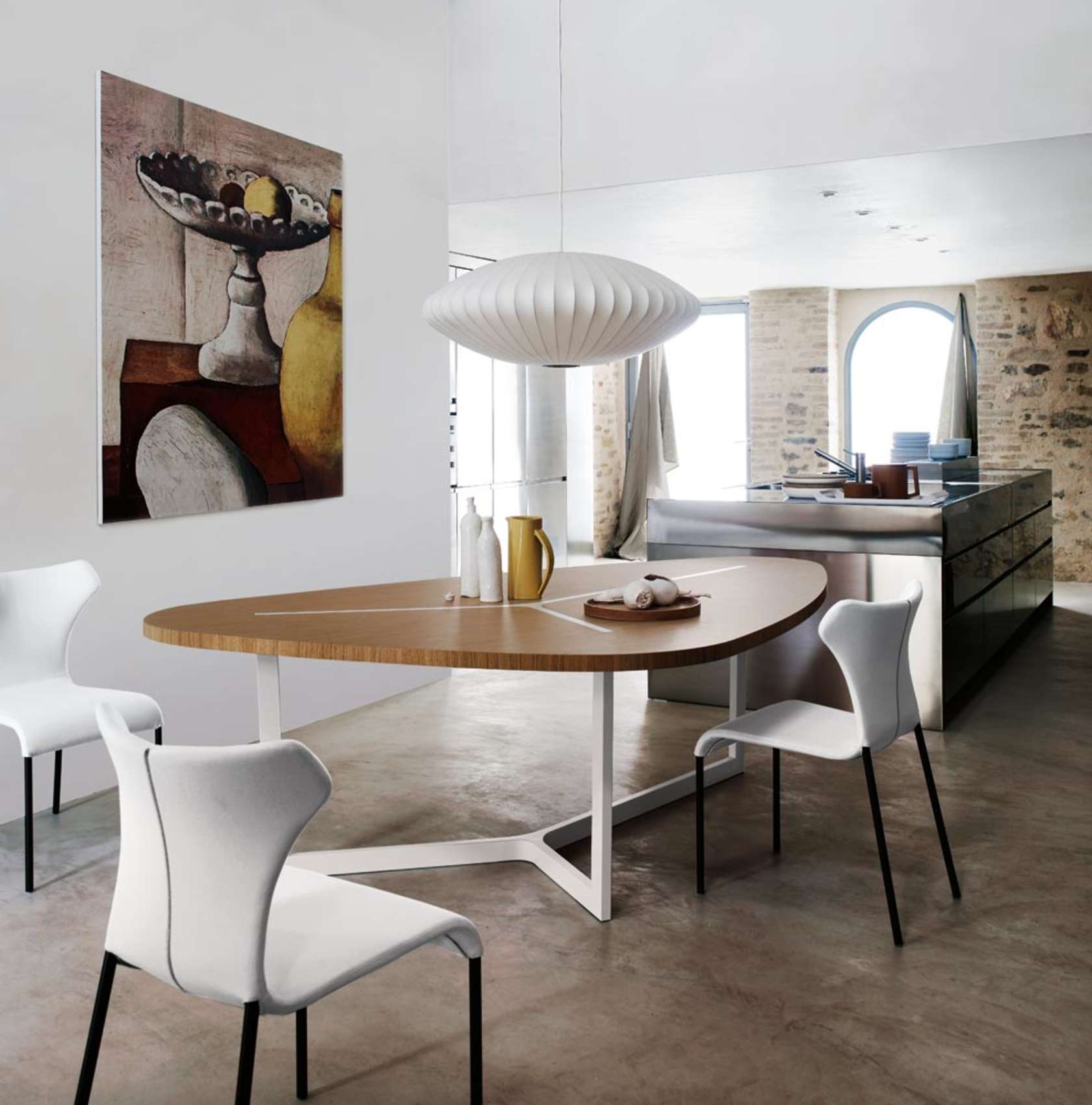 Das ovale Modell hat die Vorteile von runden und rechteckigen Tischen. Es kann viele Geschirr und Geräte aufnehmen, es kann eine große Firma unterbringen, hat keine scharfen Ecken und sieht in jedem Interieur elegant aus.In der Regel können ovale Produkte in einen runden Tisch umgewandelt werden, der weniger Platz benötigt. Arbeitsplatten dieser Form sind auch aus verschiedenen Materialien, ob Holz, Kunststoff, Rattan oder Glas.