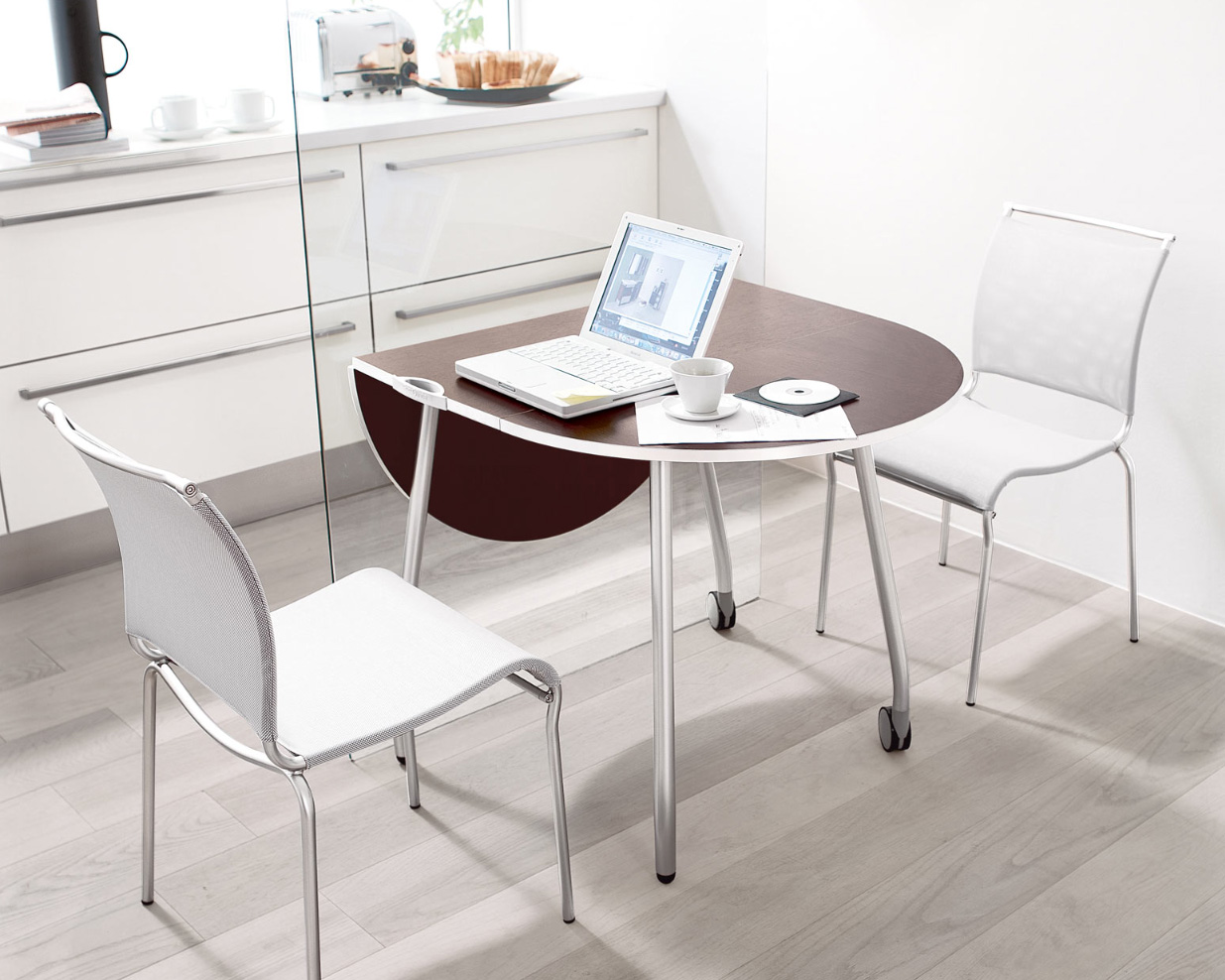 Der Klapptisch löst auch in den kleinsten Räumen Probleme mit einem Essplatz. Bei diesem Modell wird davon ausgegangen, dass ein Teil des Produkts in der Wand montiert ist und der andere sich bei Bedarf entfaltet und entfernte Beine aufweist. Es bietet Platz für bis zu drei Personen. Es gibt auch quadratische, halbrunde und rechteckige Formen.
