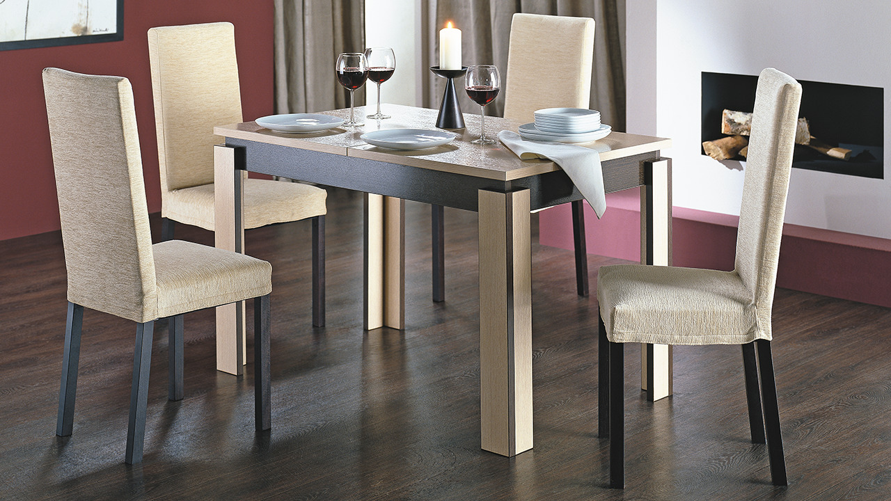 Das Falzmodell vergrößert sich aufgrund der Tatsache, dass seine Seitenteile vorgeschoben werden. In der zusammengebauten Position sind diese Elemente unter der Tischplatte verborgen.