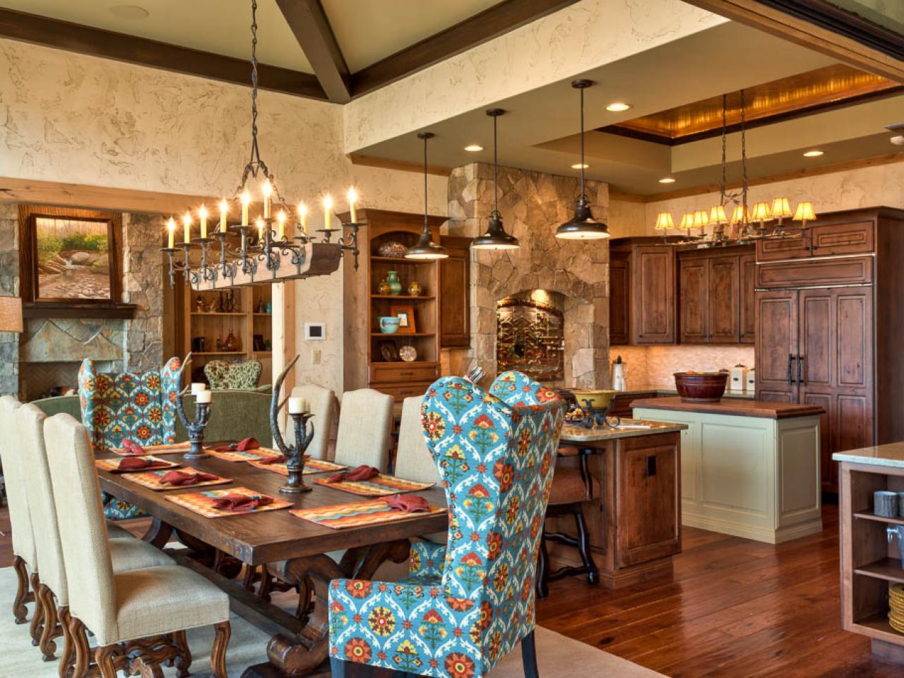 Für den klassischen Tisch passen Holzstühle mit Textilbezug. Um solche Möbel vor starker Abnutzung zu schützen, können Stoffabdeckungen für Stühle verwendet werden. Dies hilft den Stühlen, länger einen ordentlichen Blick zu behalten, und die Farben der Sitze können mit der gleichen Leichtigkeit wie das einfache Ersetzen der Vorhänge geändert werden.