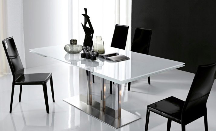Der rechteckige Tisch ist ein klassisches Modell. Passt in jedes Interieur und jeden Stil. In der Regel, in der Nähe der Wand platziert, und mit einer großen Anzahl von Gästen wird in der Mitte des Essbereiches.Abhängig von der Gestaltung des Raumes, können Sie eine klassische dunkle, modische helle Farbe für eine moderne helle Küche oder Glas auf Metallbeinen für eine Hightech-Küche wählen.