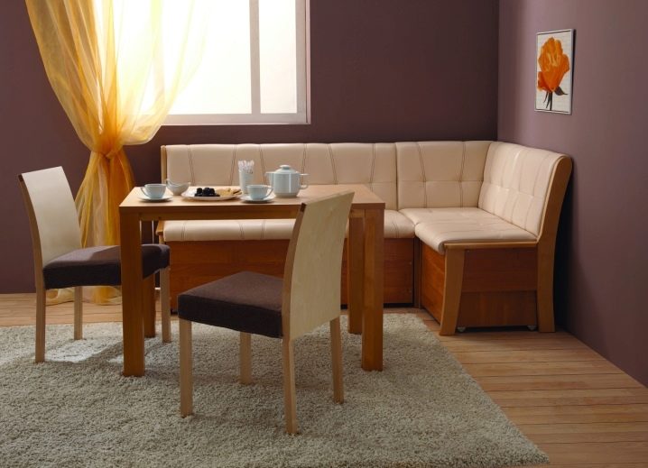 Sitzbereich - eine der beliebtesten Lösungen für Küchen jeder Größe. Diese Sitze sind recht komfortabel und Platz an der Wand entlang nach Standort speichern. Unter dem Sitz, in der Regel sind Boxen für die Lagerung von Küchenutensilien und anderen kleinen Dingen. Mini-Sofa kann als zusätzliche Sitzgelegenheiten verwendet werden.