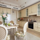 Der runde Tisch im Inneren der Provence sieht selbst unter den Bedingungen eines kleinen Platzes erstaunlich aus; schauen Sie, wie organisch das Möbelstück die Farbe von natürlichem Holz in einem Duett mit einer bescheidenen Kochzone und -dekor aussieht. Bild 1