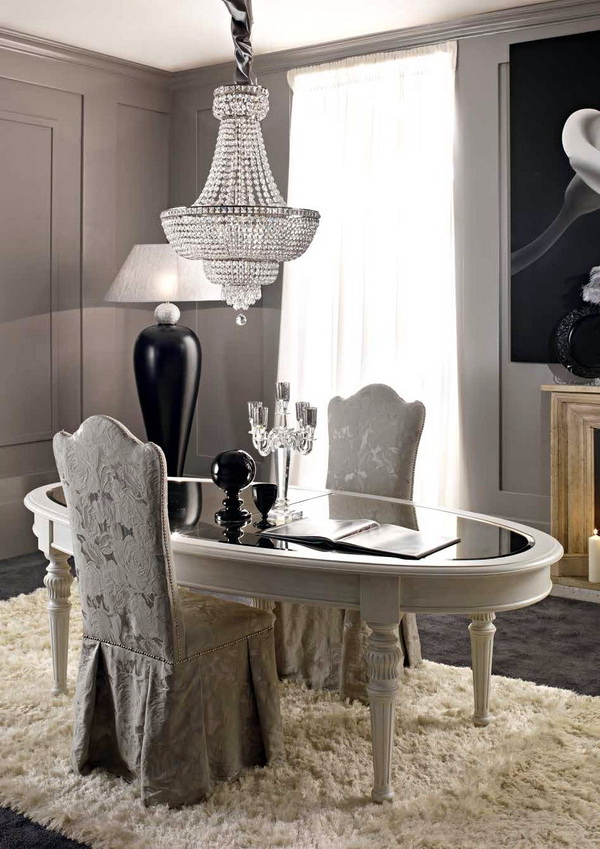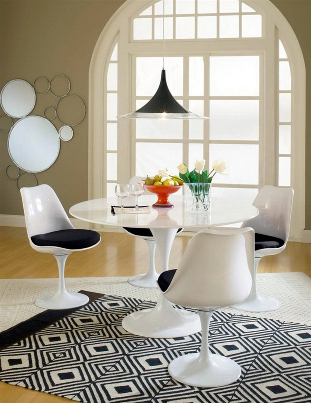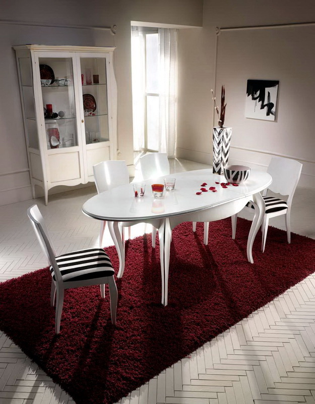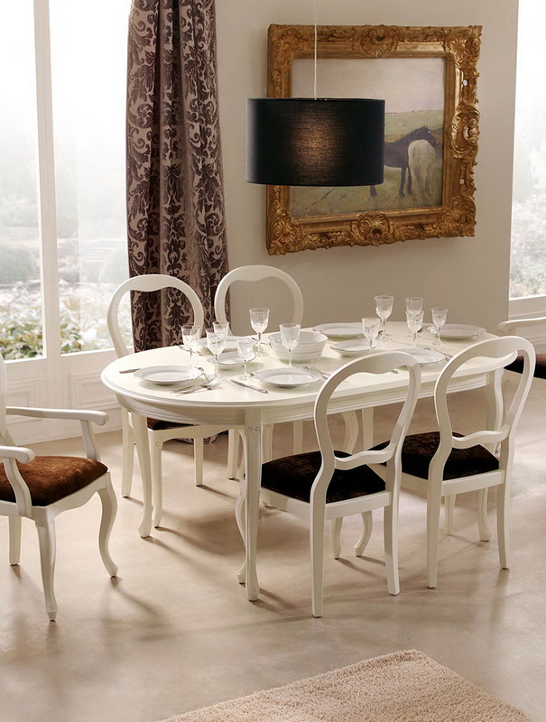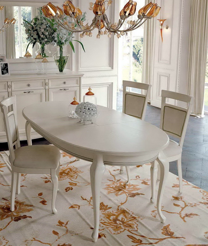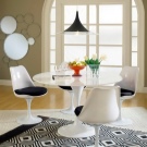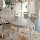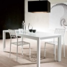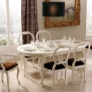 - Die weiße Farbe des Tisches passt in jeden Raum und in jede Richtung. Es ist wichtig, die Form der Tischplatte und der Beine zu wählen: Wählen Sie für den klassischen und romantischen Stil runde oder ovale Möbel auf einem massiven Bein oder rechteckige Modelle mit Fliesen.Für ein minimalistisches Interieur und High-Tech-Style eignen sich Kunststoffmodelle mit glänzender Oberfläche oder mit Fotodruck.
