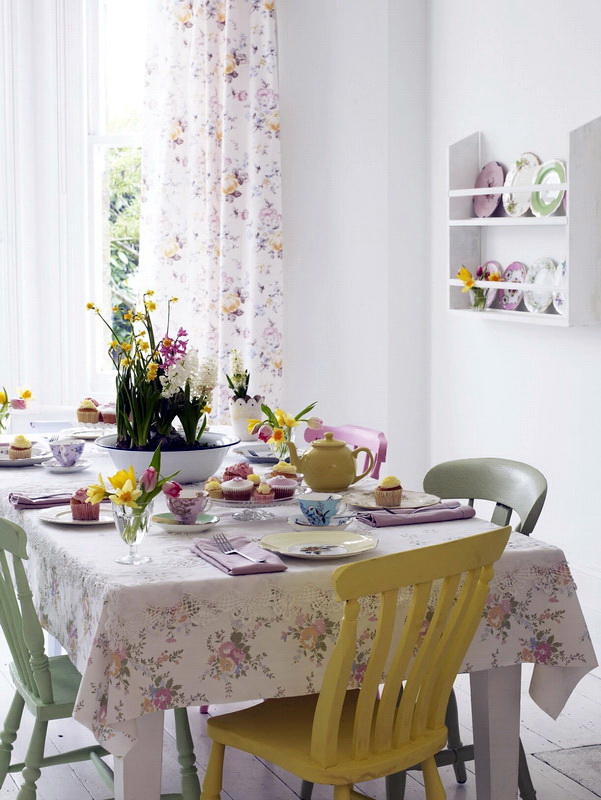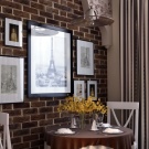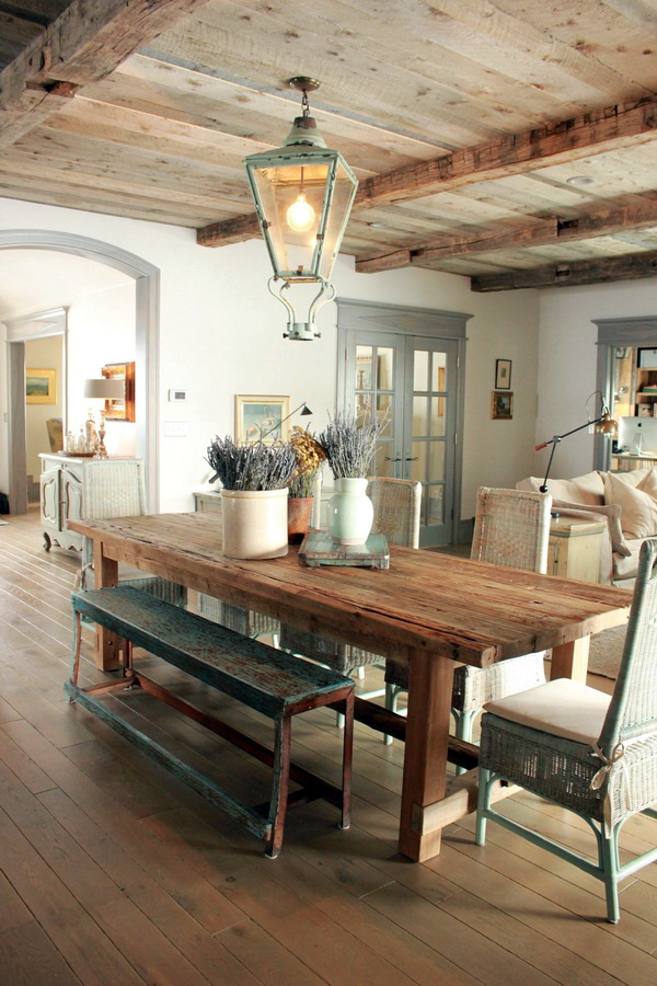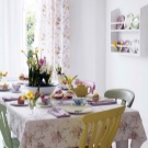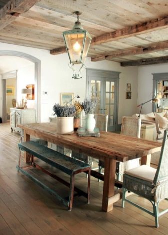 Die Wand über dem Esstisch sollte nicht leer sein, sonst wird das Innere der Vollständigkeit und Anmut beraubt. Im rustikalen Innenraum wären offene Regale oder Paneele in massiven Holzgestellen in Weiß oder Holzfarbe angebracht. Die Regale werden nicht nur die Dekoration des Raumes, sondern auch ein funktionelles Objekt für die Aufbewahrung von Geschirr, Gewürzen und Ölen, Lebensmitteldosen, offene Hängekonstruktionen werden perfekt mit Blumen, Kerzenständer, Kochbuch und anderen Dekorationen kombiniert.