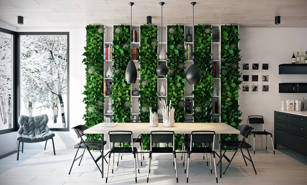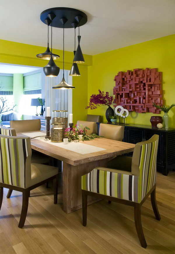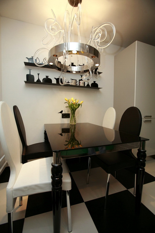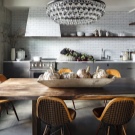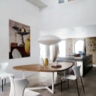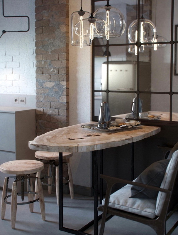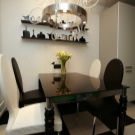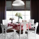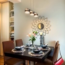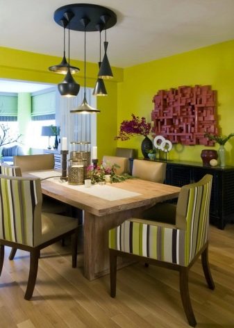 Um einen gemütlichen Tisch in einem modernen, geräumigen Apartment zu gestalten, müssen Sie den Essbereich mit einer funktionalen Wandleuchte oder einer Lampe dekorieren.Übrigens ist es nicht empfehlenswert, einen Spiegel in den Essbereich zu hängen, es ist besser, sich auf ein anderes Dekor zu beschränken.