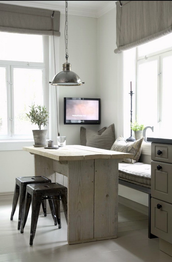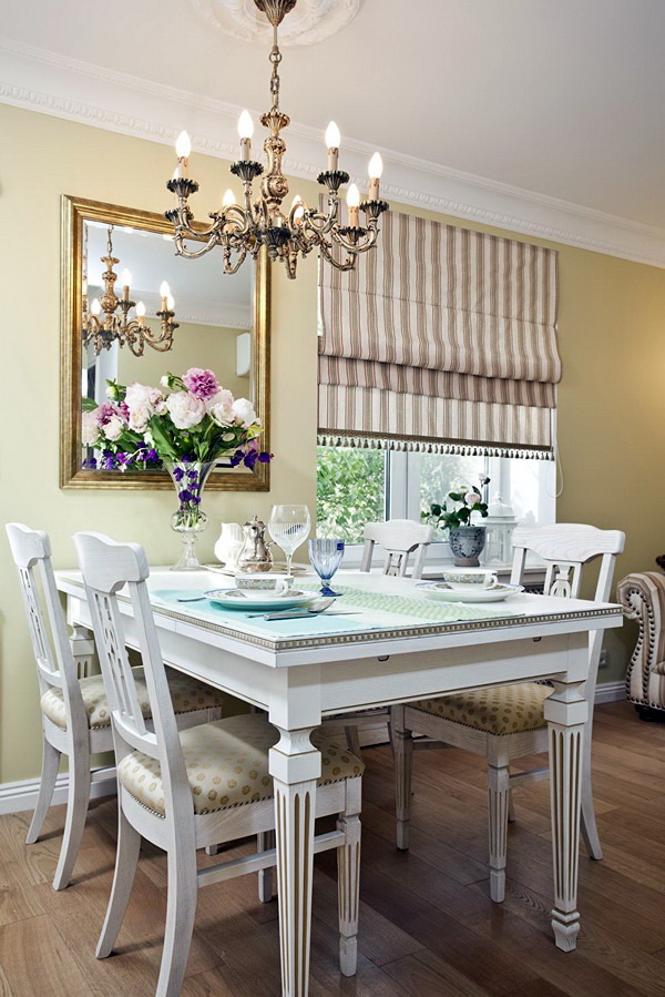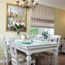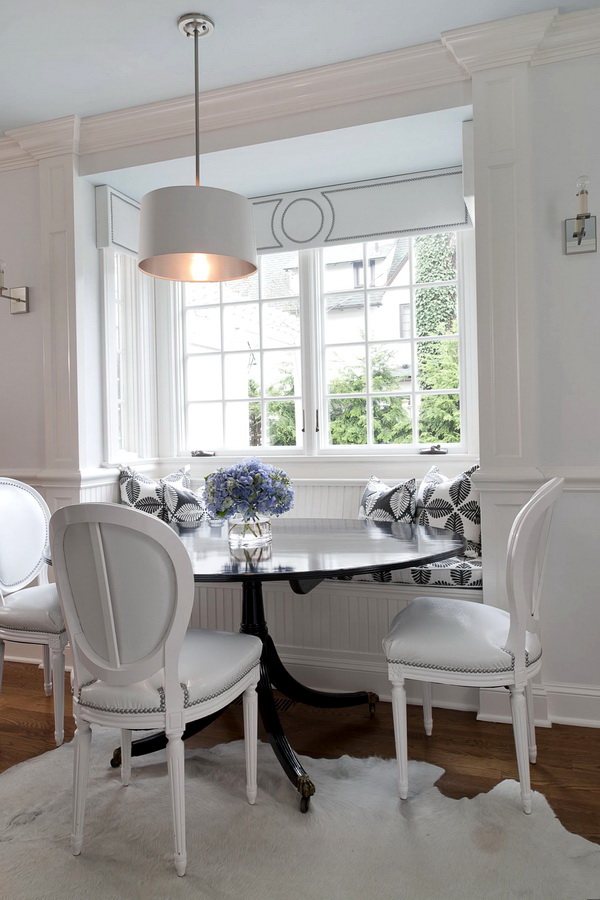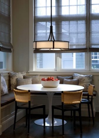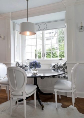Die Position am Fenster ermöglicht es Ihnen, den Essbereich hell und freundlich zu gestalten. Ein Fenster in der Küche ist an sich ein angenehmes Phänomen, und das vorteilhafteste wird aussehen wie ein rundes Möbelmodell auf einem massiven Bein (für ein klassisches oder englisches Interieur, irgendein romantisches oder rustikales).