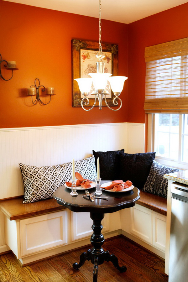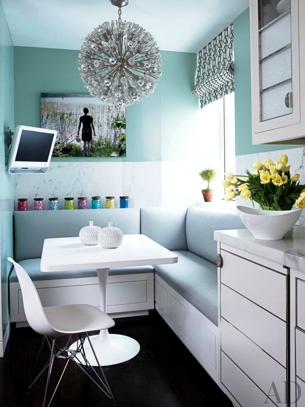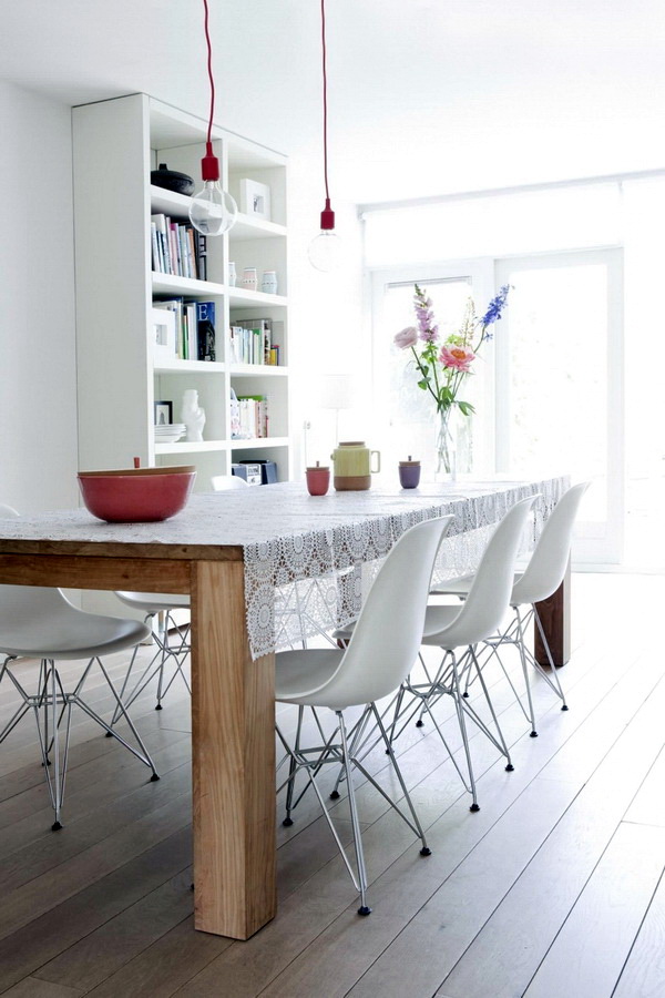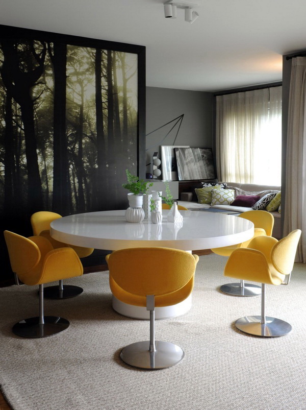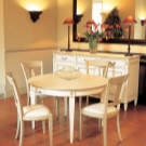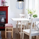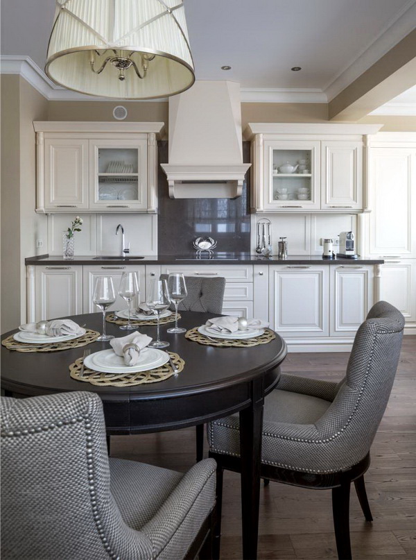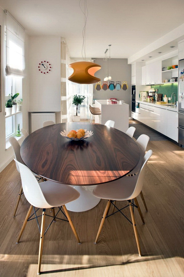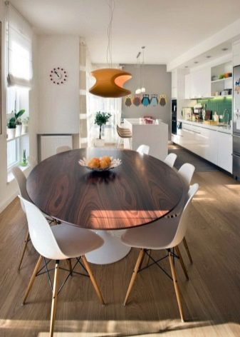 - Der runde Tisch nimmt trotz seiner kompakten Größe mehr Platz ein; Um Platz zu sparen, installieren Sie es in der Ecke des Esszimmers, und wenn die Gäste einfallen, bewegen Sie es einfach in die Mitte des Raumes und holen Sie sich noch ein paar leere Plätze.