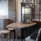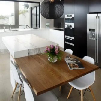- Rechteckige Küchenmodelle finden sich am häufigsten im Esszimmer und wirken prägnant in jedem Interieur. Rechteckformmodelle unterscheiden sich in Größe und Funktionalität, sind aber gleichermaßen für die Platzierung in kleinen und geräumigen Räumen geeignet; Zur rationellen Raumnutzung in engen Räumen ist es angebracht, die Möbel in eine Ecke zu stellen oder sie an einer Wand gegenüber der Kochzone oder senkrecht dazu zu befestigen. In der geräumigen Küche ist ein rechteckiger Tisch einen Meter von der Wand entfernt platziert, nicht in der Nähe gezogen und bildet eine Insel in der Mitte des Raumes.