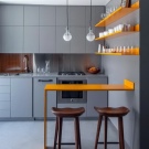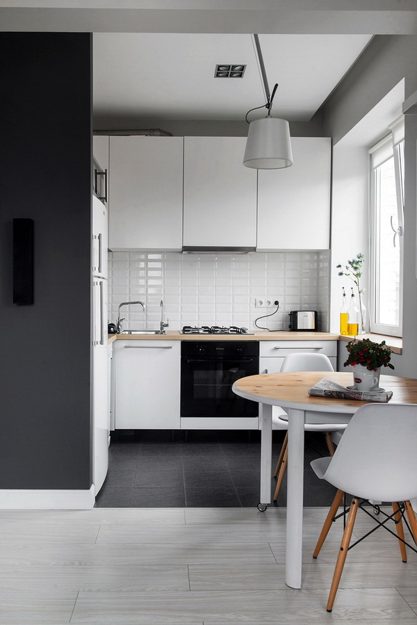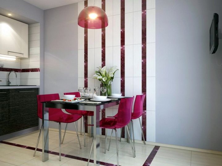 Traditionell haben Esstische eine Wand parallel zur Kochzone; Dieser Ansatz erlaubt es uns, keinen freien Platz zu verlieren und den Tisch "in vollen Zügen" für die Ankunft der Gäste zu benutzen, indem wir ihn von der Wand wegbewegen.