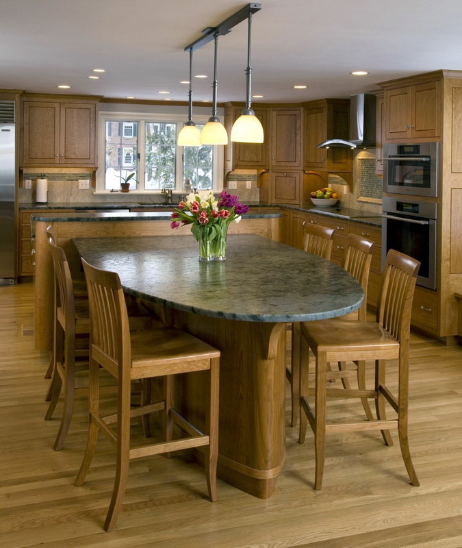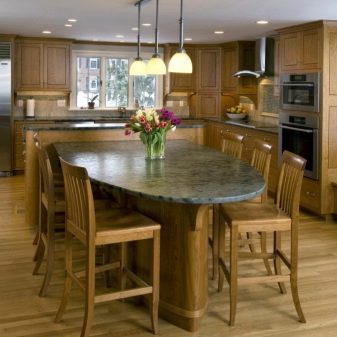 - Moderne ovale und runde Hochmöbelmodelle sind zu empfehlen, wenn Sie Kinder in der Familie haben, denn die Möbel haben keine scharfen Ecken und wirken als sicheres Element der Wohnung. Ovale und runde Arbeitsplatten sehen in der geräumigen Küche harmonisch aus, da sie mehr Platz für die Platzierung benötigen und mehr Gäste aufnehmen können.