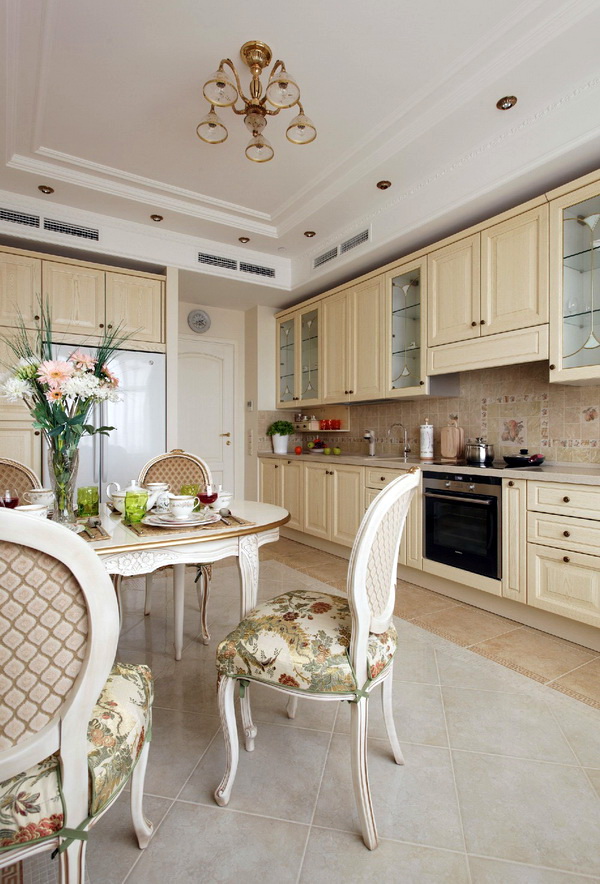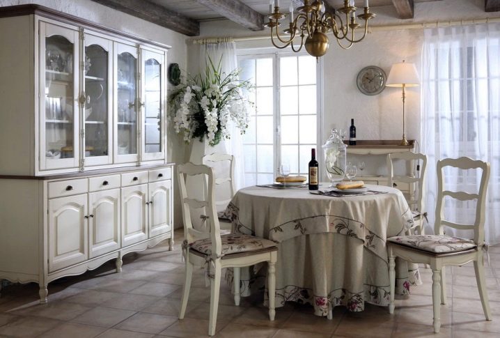 - Holzmöbel (Massivholz oder MDF) mit natürlichen natürlichen Mustern und Holzstruktur ergänzen das Interieur im provenzalischen Stil. Jedes Holzmöbel in der Küche wird den Klassikern angemessen sein - das für uns gebräuchliche oder streng englische, von dunklen, satten Möbelfarben dominierte.