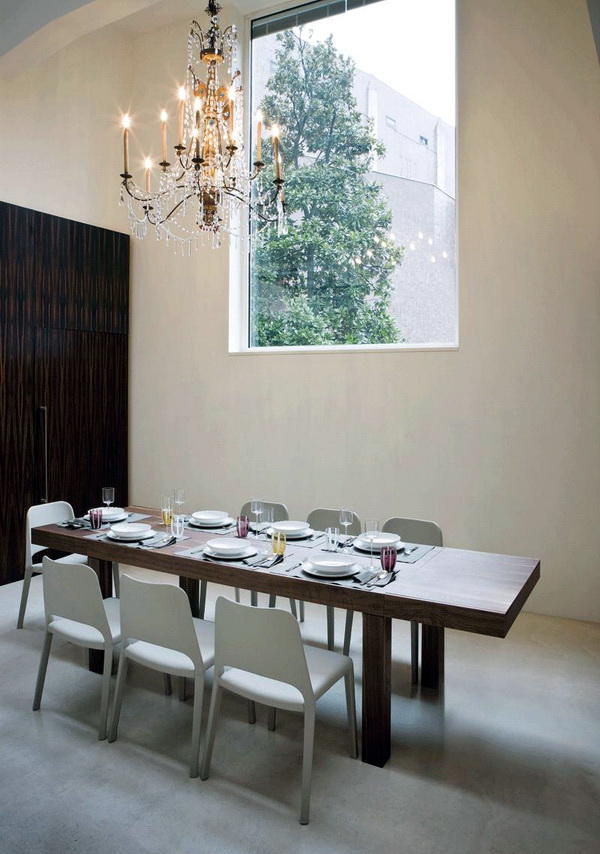 Platzieren Sie eine rechteckige Tischplatte näher an der Mitte des Raumes, um ihr großes Quadrat zu ermöglichen. Traditionell befindet sich der Tisch 1-1,5 Meter von der Wand entfernt, um zusätzliche Sitzplätze zu bieten.Die rationelle Platzierung des Esstisches ermöglicht es Ihnen, mehr oder weniger Personen hinter sich zu platzieren. Ein rechteckiges Möbelstück von 120x80 cm passt 6 Personen "frei" von der Wand, aber wenn Sie den Tisch in die Nähe bewegen, verringert sich die Kapazität nur um eins Person.