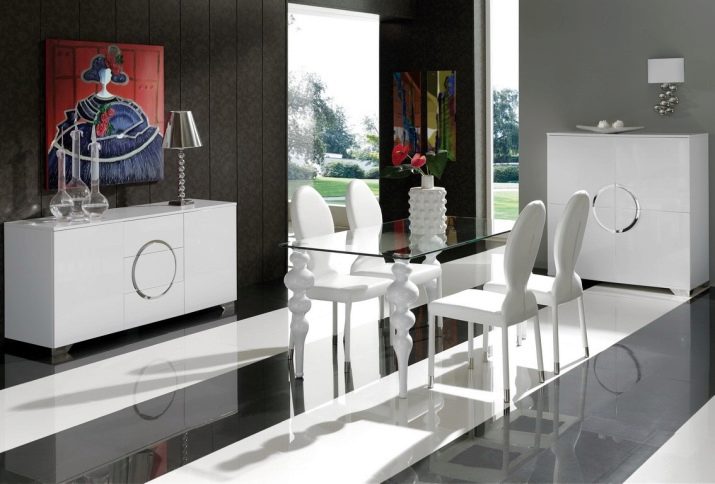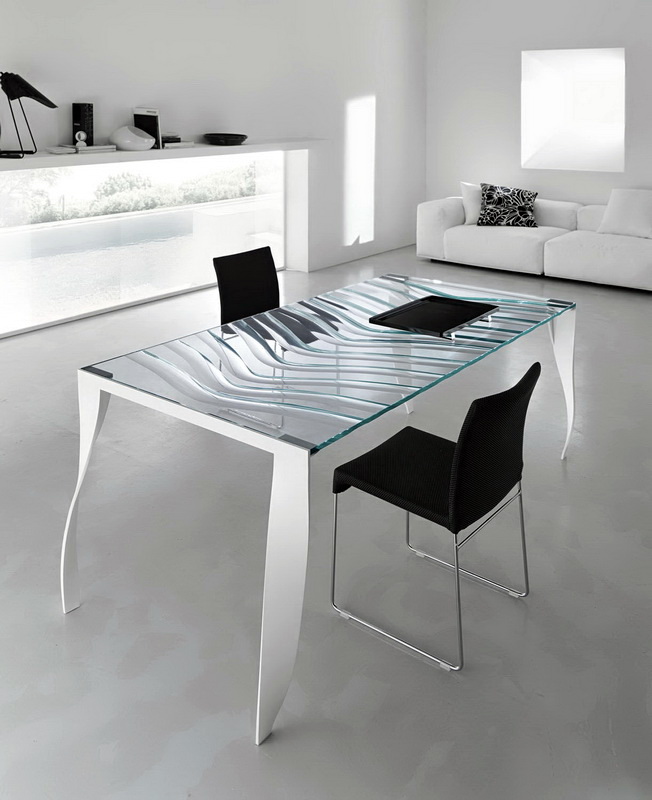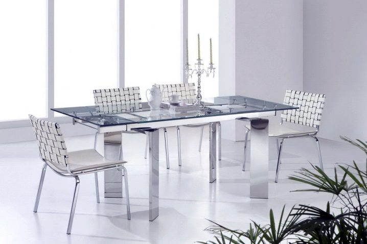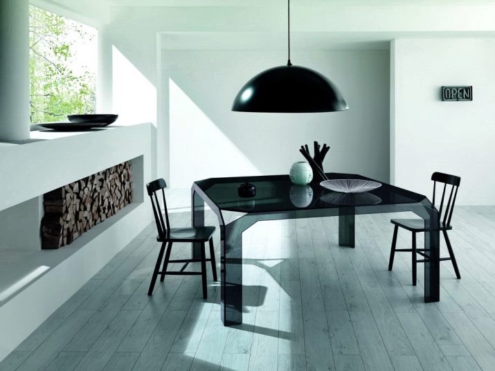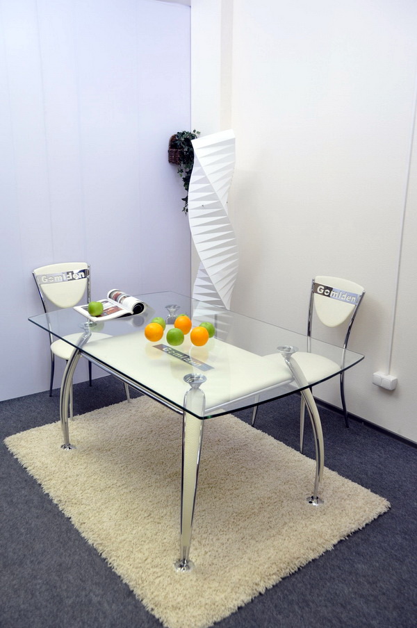 Glas als Tischmaterial wirkt in der Komposition von Küche oder Wohn-Esszimmer stilvoll und prägnant. Die glänzende Oberfläche des Materials wird in die Hände eines kleinen Küchenraums spielen und den Raum visuell erweitern. Eine ebenso gute Tischplatte aus gehärtetem Glas sieht in dem geräumigen Raum eines modernen Interieurs aus - Hi-Tech, Minimalismus, Modernität, Futurismus.