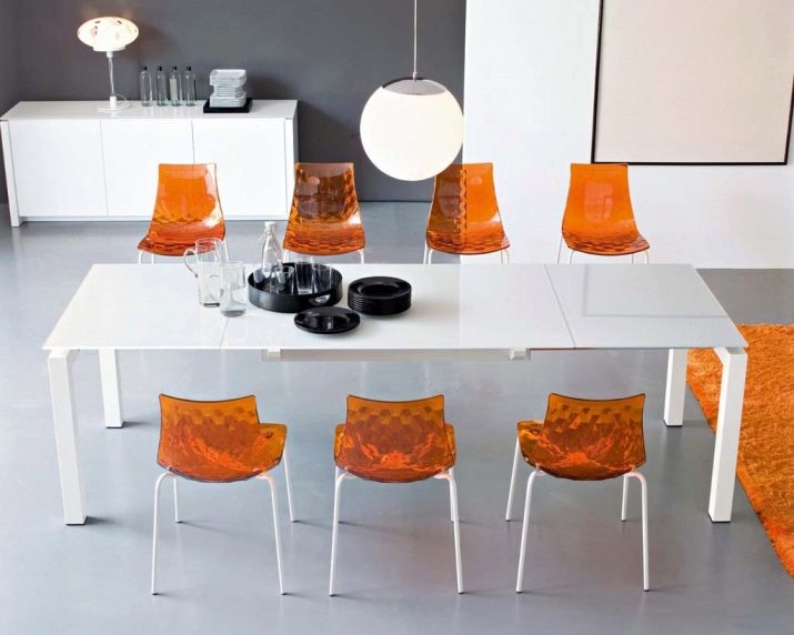 Kunststoff-Esstisch mit einem glänzenden Deckel sieht originellen, leichten Design ermöglicht es Ihnen, Möbel von Raum zu Raum oder im gleichen Raum zu mischen, das Bild der Küche zu ändern. Die Vorteile von Plastikmodellen für die Küche sind ihre geringen Kosten, eine Vielzahl von Formen und Schattierungen, Leichtigkeit und Wartung - wischen Sie einfach den Tisch mit einem feuchten Schwamm ab und denken Sie nicht darüber nach, wie Sie den komplexen Schmutz entfernen können.