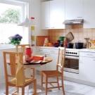 Es gibt auch viele Designlösungen, die in modernen Küchen erfolgreich umgesetzt werden. Einer davon ist ein Schiebetisch-Transformator, der auf speziellen Schienen von eingebauten Bodenschränken ausgeht und einen kleinen Tisch und Sitze nachahmt. Ein solcher Mechanismus ist nützlich für kleine Küchen, deren Anordnung es nicht erlaubt, eine große Menge an Möbeln zu platzieren.