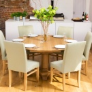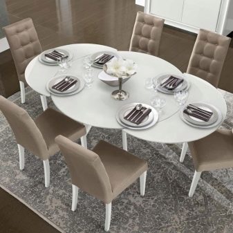 In der faltbaren Version des Tischs kann eine ausreichende Anzahl von Gästen untergebracht werden, um jeden Feiertag mit einem großen Maßstab zu feiern: Jahrestag, Geburtstag, Neujahr, usw. Der Baum ist zu leichtem Tonen, Malen und Polieren geeignet. Von den individuellen Vorlieben des Kunden hängt die Form der Modelle ab, die oval, rund, quadratisch, rechteckig sein können.