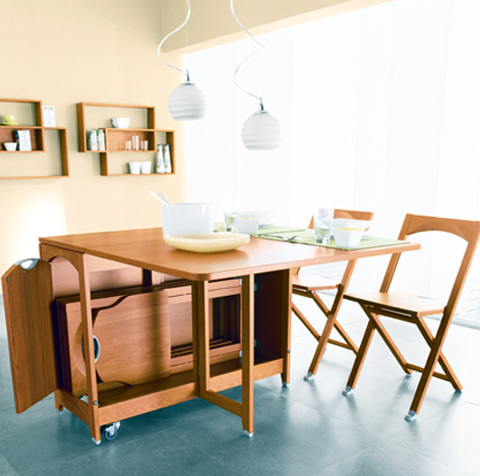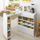 Produkte mit einer klappbaren Tischplatte schaffen eine interessante Anordnung von Regalen entlang der Wand. Zusätzlich kann der Tisch ein Zubehörset oder Haken aufweisen, auf dem sich einige Küchenutensilien bequem aufbewahren lassen.