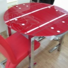 Ähnliche Produkte können mit zusätzlichen Regalen, Tischstützen dekoriert werden. Oft machen Hersteller solche Elemente matt, mit sandgestrahlten Mustern verziert. Dank moderner Technologie kann jeder Druck in Form eines Films auf die Tischplatte selbst aufgebracht werden. Es ist von innen angebracht, so dass es nicht gelöscht wird, verbrennt und sich während des Betriebs nicht verschlechtert.