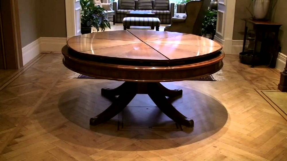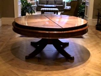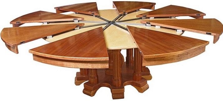 Die komplexesten Mechanismen werden als runde Tische angesehen. Bei einem Schiebesystem sind sie in spezielle Sektoren mit separaten Befestigungen unterteilt. Sie erscheinen in einer Spirale, wodurch sich die Fläche des Produkts fast um das Zweifache vergrößert. Für den Betrieb eines runden Tisches müssen Sie nur die Haupttischplatte in der einen oder anderen Richtung scrollen.