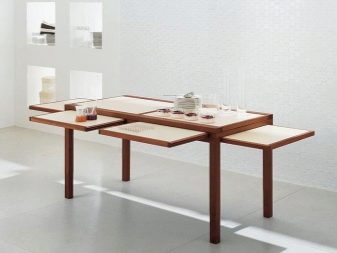 Modelle, die geändert werden können, sind für Küchen mit kleiner Fläche geeignet. Solche Möbel verstopfen den Raum nicht und erlauben es Ihnen, eine große Anzahl von Menschen zu platzieren. Abhängig vom ausgewählten Modell können Sie die Größe der Tabelle ändern und sie mehr als 2 Mal erhöhen. Verschiedene Hersteller bieten an, nicht nur die Länge der Tische, sondern auch ihre Höhe zu ändern, indem sie es in ein Esszimmer und dann in ein Magazin verwandeln.
