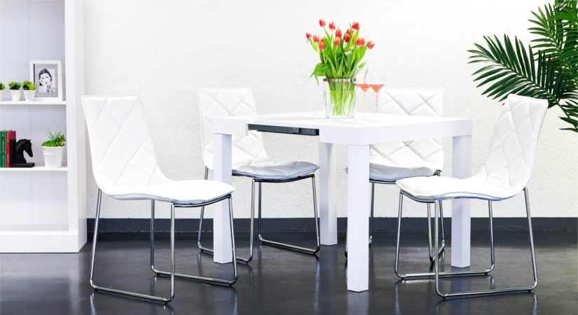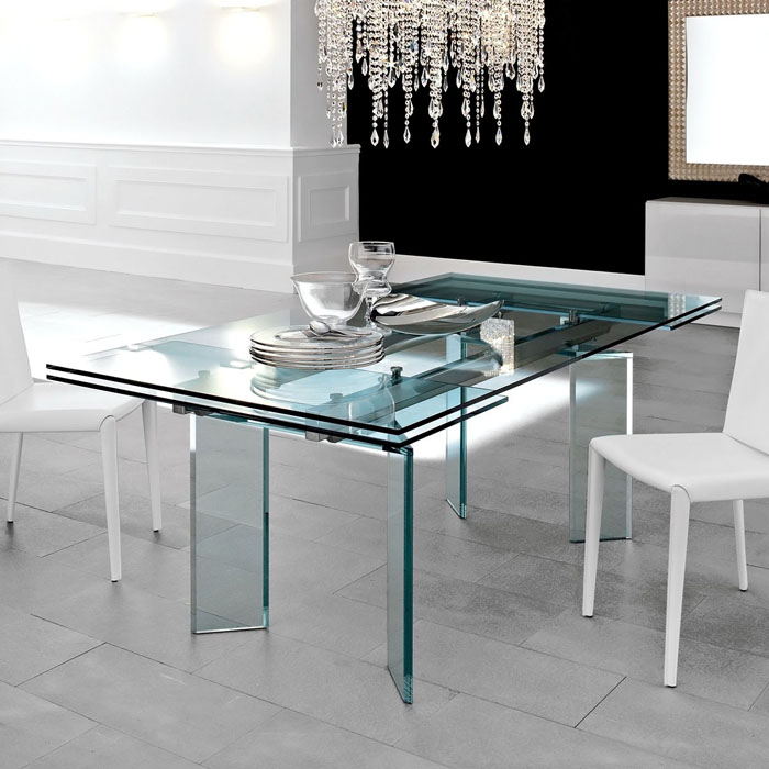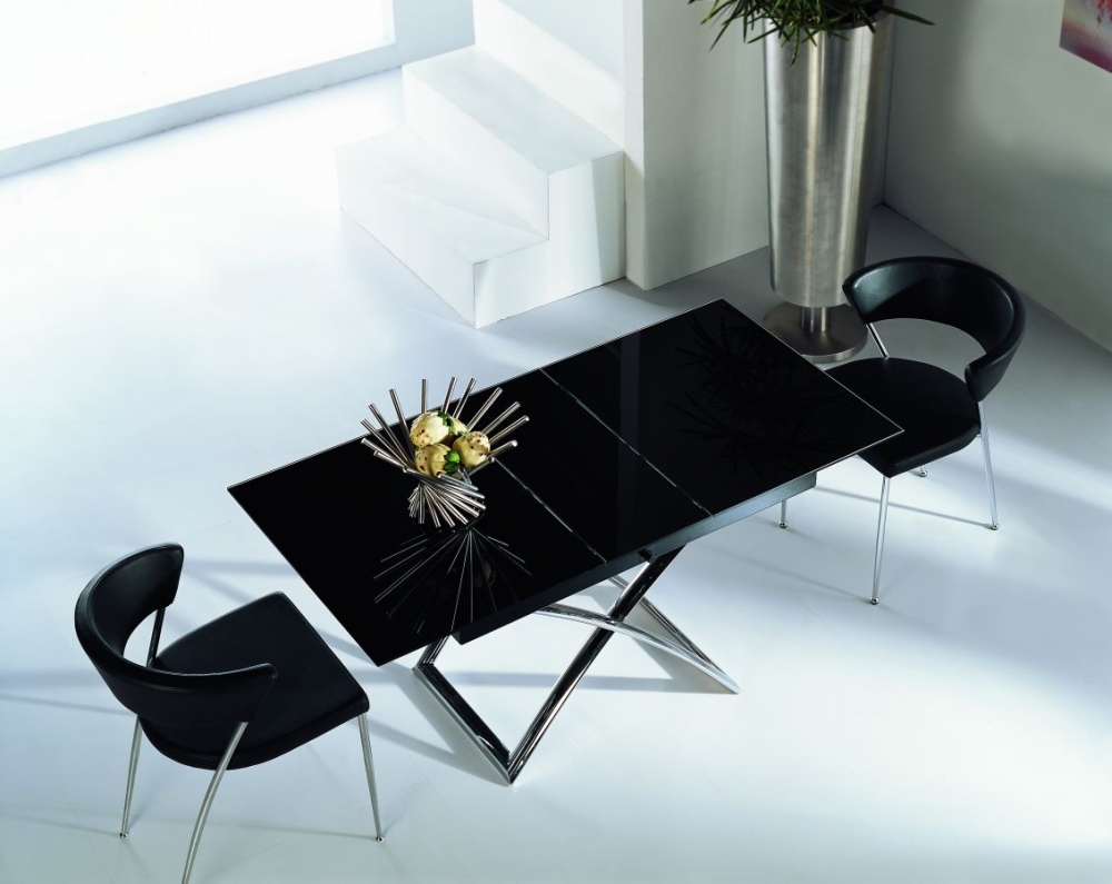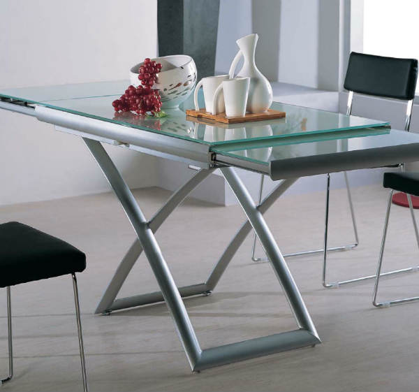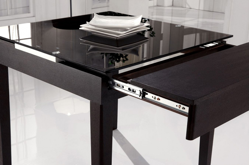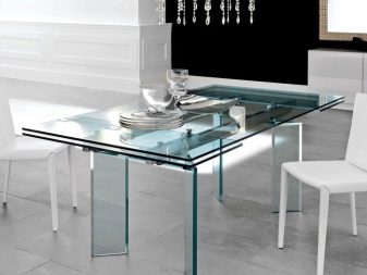 Die häufigste Option waren Glastabellen, die geändert werden können. Aufgrund ihrer Transparenz und der Möglichkeiten des Materials fügen sie sich organisch in das Design jeder Küche ein, von klassisch bis modern. Das Produkt sieht einfach, anspruchsvoll, stilvoll aus.