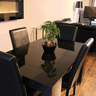Während des Betriebs emittiert das Glas keine schädlichen Substanzen. Es ist gehärtet, schlagfest, hält hohen Temperaturen stand.Sie können jedes Geschirr auf einen solchen Esstisch aus Glas stellen. Er wird nicht knacken, wird sich nicht teilen. Auf einem speziellen hitzebeständigen Glas ist es schwierig, einen Kratzer zu hinterlassen, abgeplatzt. Auch bei der Pflege wird das Produkt nicht kapriziös: Flecken, Spuren und Fingerabdrücke können mit einem trockenen oder feuchten Tuch entfernt werden.