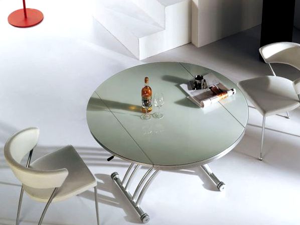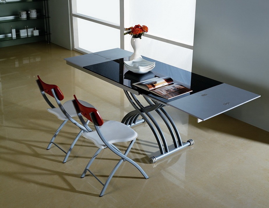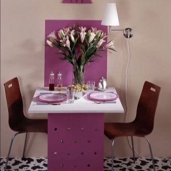 Die meisten der "Transformers" haben einen stilvollen modernen Look, passen in eine Vielzahl von Einrichtungsstilen und verändern die Atmosphäre der Küche mehrmals am Tag radikal. Sie müssen Transformationstabellen nicht nur für den beabsichtigten Zweck verwenden. Wenn Sie ein Modell mit hohen Beinen kaufen, erhalten Sie darunter einen exquisiten Bartresen.